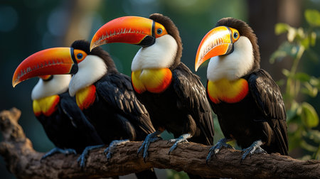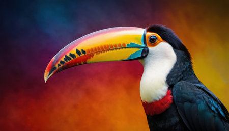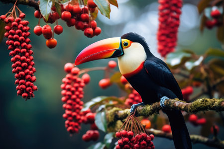 ai generated, toucan, bird, beak, wildlife, fauna, nature, orange, tropical, beautiful, red, animal, colorful, natural, background, wild, green, yellow, forest, south american, clouds, eco, plants, woods, toucans, birds, big bird, zoo, jungle, branch, illustration, black, exotic, colored, design, isolated, tree, drawing, leaves, evening, vector image, bushes, environment, creepers, outdoor, amazon, misty, lush, leaf, branches