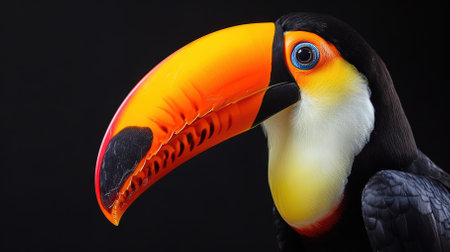 Toco Toucan bird's face front view, vibrant colorful beak close up, orange and yellow bill with a unique pattern of red markings and glossy blue eyes.