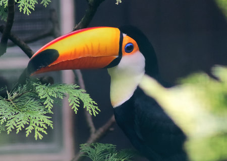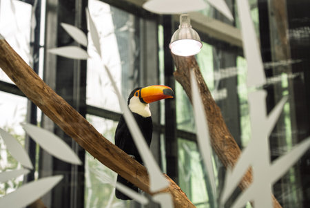Toucan in Exotarium.Interior view of the Exotarium. showcasing aquariums with exotic fish, terrariums with reptiles, and educational displays of insects and wildlife. Sosnowiec Exotarium in Poland.