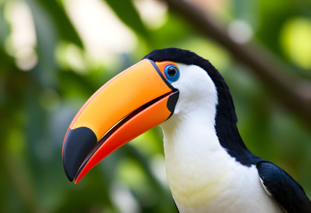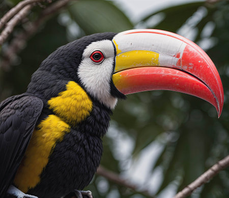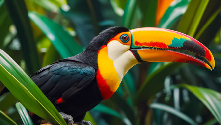 Vibrant toucan sits perched on a branch amidst lush green foliage, its colorful beak and bright eyes standing out against the natural backdrop