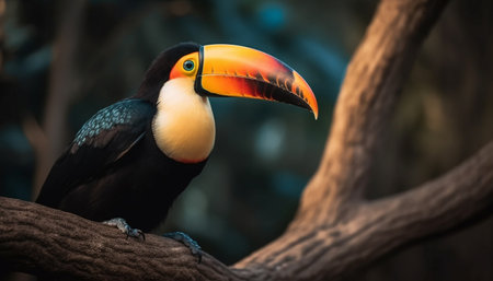 Toucan perching on branch in vibrant multi colored tropical rainforest generated by artificial intelligence