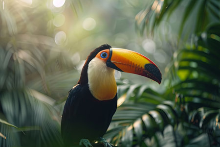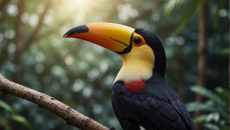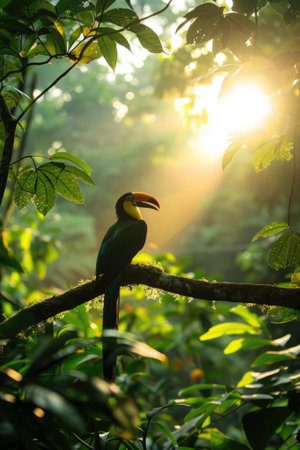 Majestic toucan on a branch with sunlight streaming through the lush jungle