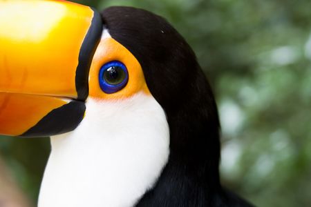 Portrait of Toco toucan (Ramphastos toco) with a big colored beak. Close-up. Brazil. Pantanal.