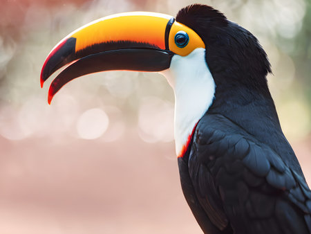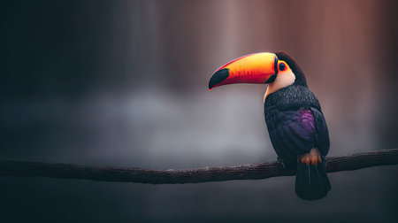 A toco toucan sits on a branch, its vivid beak prominently displayed against a softly blurred backdrop, emphasizing its striking colors and features.
