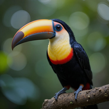 A stunning close-up image of a vibrant toucan perched gracefully on a branch, showcasing its colorful beak and striking feathers against a lush green background.