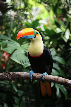 A vibrant toucan perched on a tree branch, surrounded by lush jungle foliage. Its beak showcases brilliant hues of orange, yellow, and blue, creating a lively and tropical aesthetic.