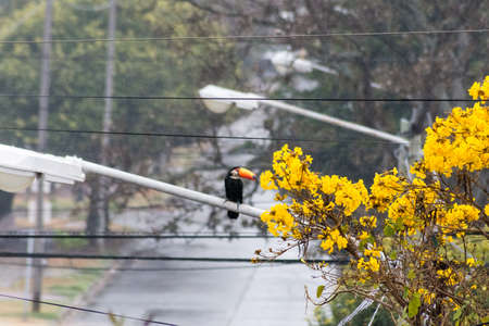 The Toco Toucan sitting on the branch of the tree in Iguacu National Park of the Iguazu Falls, one of the worlds largest and most impressive waterfalls, Foz de Iguacu, Parana State, Brazil