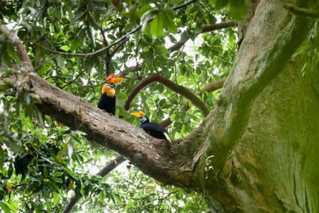 Two big birds or Great Hornbill on bunch of tree. Beautiful Hornbill perch together on tree in rainforest of Asia.