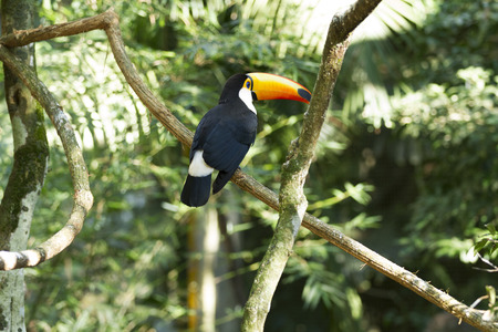 Toucan bird sitting on a branch in the rainforest.