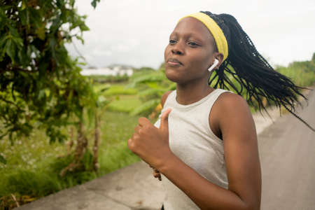 young black runner girl enjoying outdoors jogging workout - young attractive and fit African American woman running at countryside road in sport practice concept and healthy lifestyle