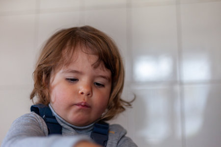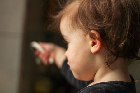 Close-up portrait of a little cute white baby with a dirty face in soft light and blurry background