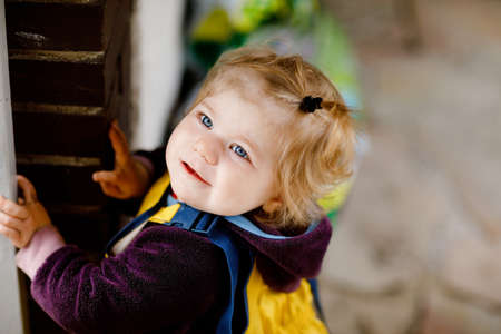 Outdoor close up portrait of adorable toddler girl having fun on playground, 1 - 2 year old kid playing in park