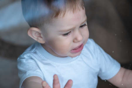 Beautiful cute baby boy looking in the window glass with reflection. Concept of loneliness of children and waiting for kindness. Orphanage and orphans