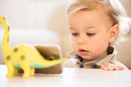 Cute little toddler boy playing with smartphone Healthy baby touching mobile phone with fingers, looking cartoons and having fun with educational apps. Child at home