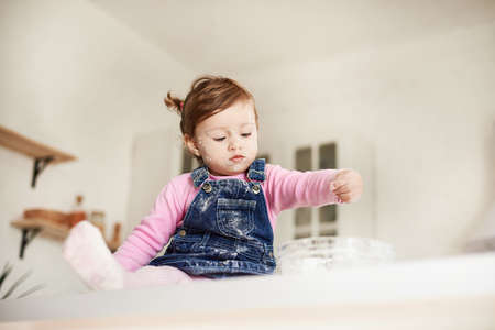 Little girl sitting on the table and pouring flour in the plate