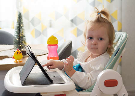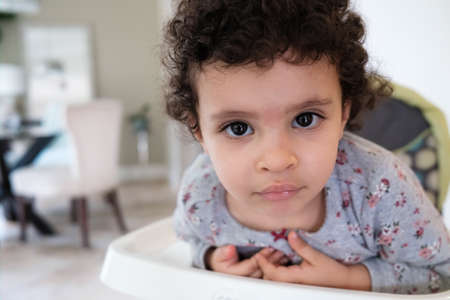 Cute two year old baby girl sitting on a high chair feeding herself in a home setting
