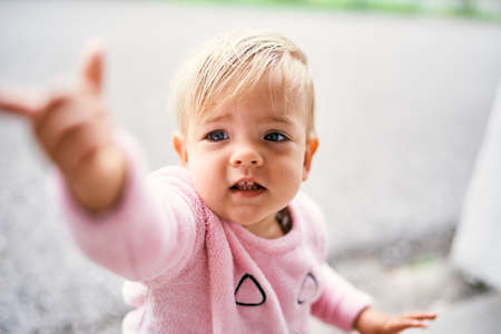 Little girl in a pink blouse stretches somewhere with her hand