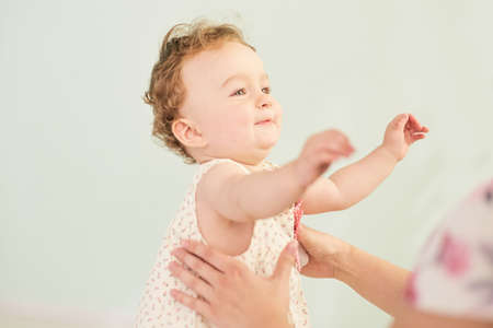 happy smiling baby girl giving hand to adult