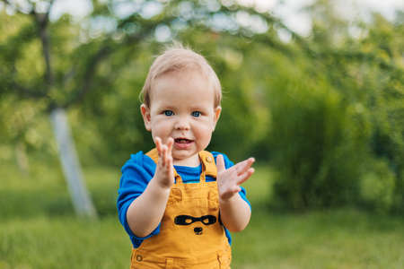 Smiling kid claps his hands in the park or garden of a summer park.