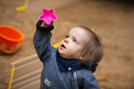 Fifteen months old baby girl playing in the sandbox in the sunset