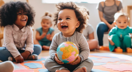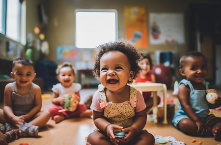 multicultural daycare center with African American toddler babies. Group of workers with babies in nursery or kindergarten playful. copyspace