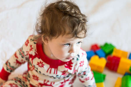 Cure toddler girl playing with colorful blocks on Christmas day.