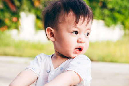 Portrait of a cute little asian boy with his mouth open