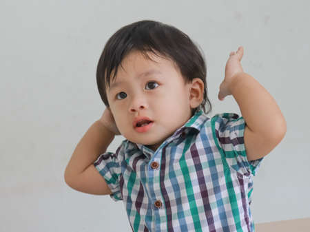 A Full Face of Adorable toddler Asian baby boy (2-year-old) Relaxing and Looking Camera in the Room with Blurry Background, Home Playing. Children's closeup portrait of activity and lifestyle concept.