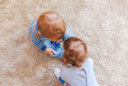 Cute little boy and girl using smartphone, top view