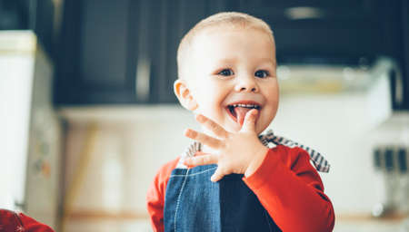 Cute adorable Caucasian kid boy with brown eyes sitting on a bed looking at camera. Funny smiling toddler boy face. Happy childhood lifestyle. Web banner header.