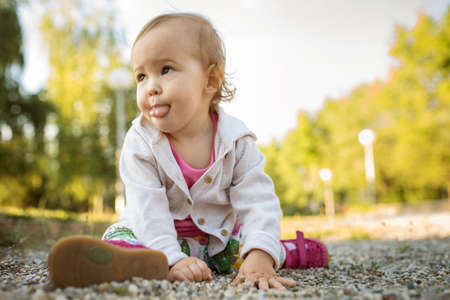 Happy 1 year old toddler playing at the playground