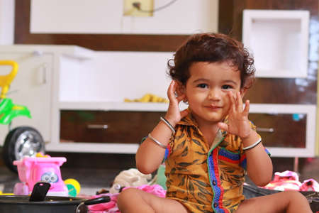 baby playing in the house with garden clothes