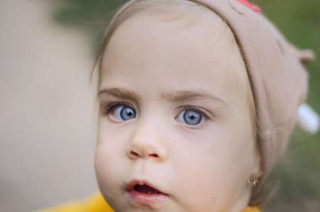 Portrait of a blue-eyed toddler girl playing outside