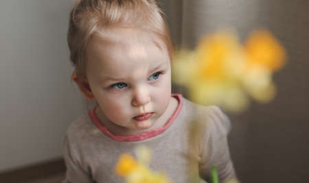 portrait of a little girl with yellow spring daffodil flower at home