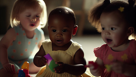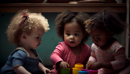 Cute African American baby girl playing with her friends at home.