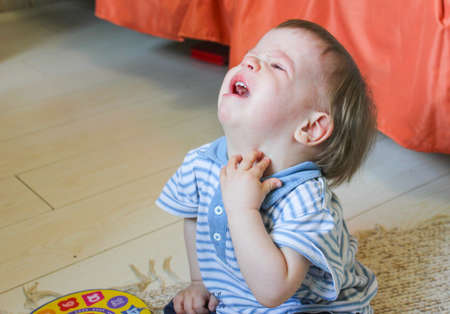 Portrait of a baby boy on a light background. The child is yawning.