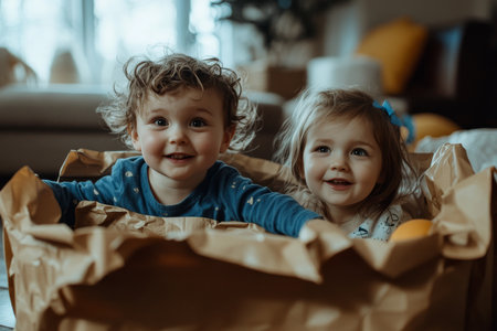 Children joyfully playing with empty boxes, smiling at the camera in a moving home scenario