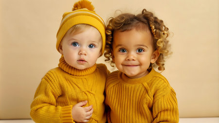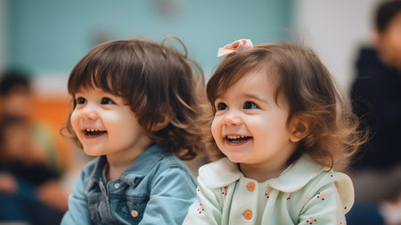 Two cute baby girls smiling, embracing, and looking at camera generated by artificial intelligence