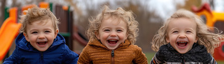 Three laughing children dash across soft grass, vibrant playground equipment behind them This image captures pure childhood joy: carefree smiles, playful bonding, and the simple pleasure of outdoor fun Their giggles echo in open spaces, a vibrant snapshot of happiness and togetherness, perfect for illustrating the magic of play AI Generative
