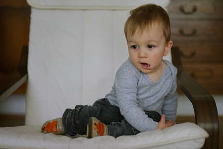 Portrait of cute little boy sitting in armchair