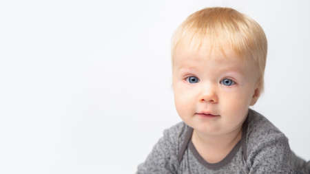 Infant child baby boy in gray shirt laughs happy looking at the camera isolated on a white background. Childcare and upbringing concept.