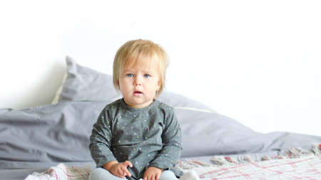 Portrait of very sweet little child. 1 year old baby sitting on the bed