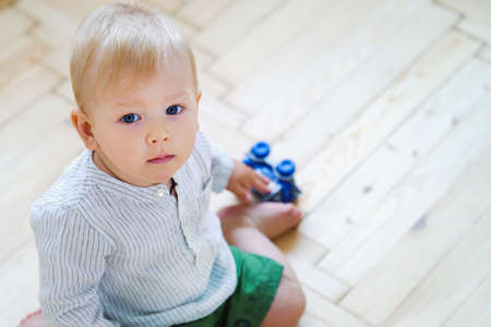 Baby boy sitting on floor and holding toy car
