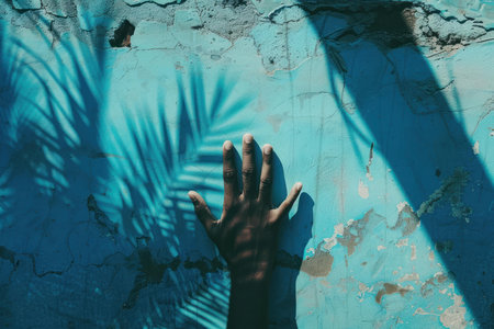 Human hand is touching a blue peeling wall, casting a tropical shadow