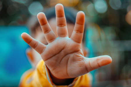 A small hand extends towards the viewer, showcasing a playful gesture and bright colors.