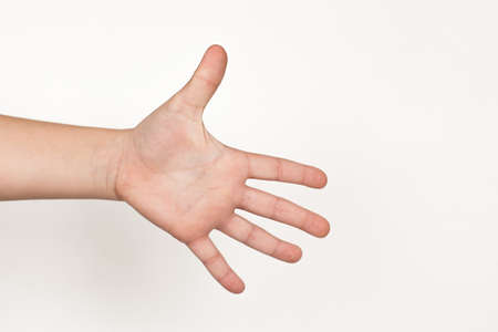 Boy raising five fingers up on hand on white background.
