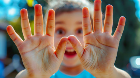 A childs hand painted with bright colors and a smile, AI