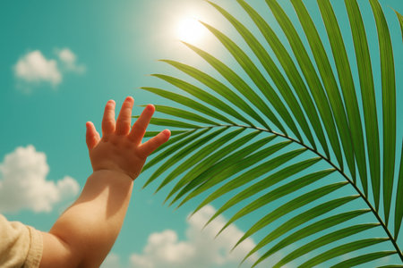 Child reaching sunlight through a green palm leaf against a clear blue sky with scattered clouds on a bright day.