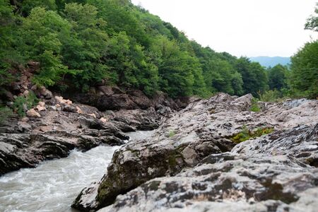 Summer landscape with mountain river, rocks and green forest
