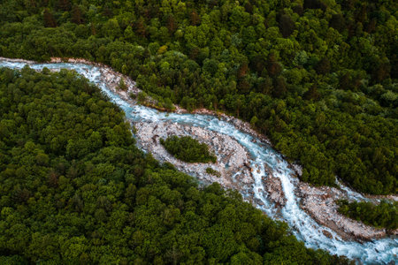 aerial view of a mountain river flowing through the forest